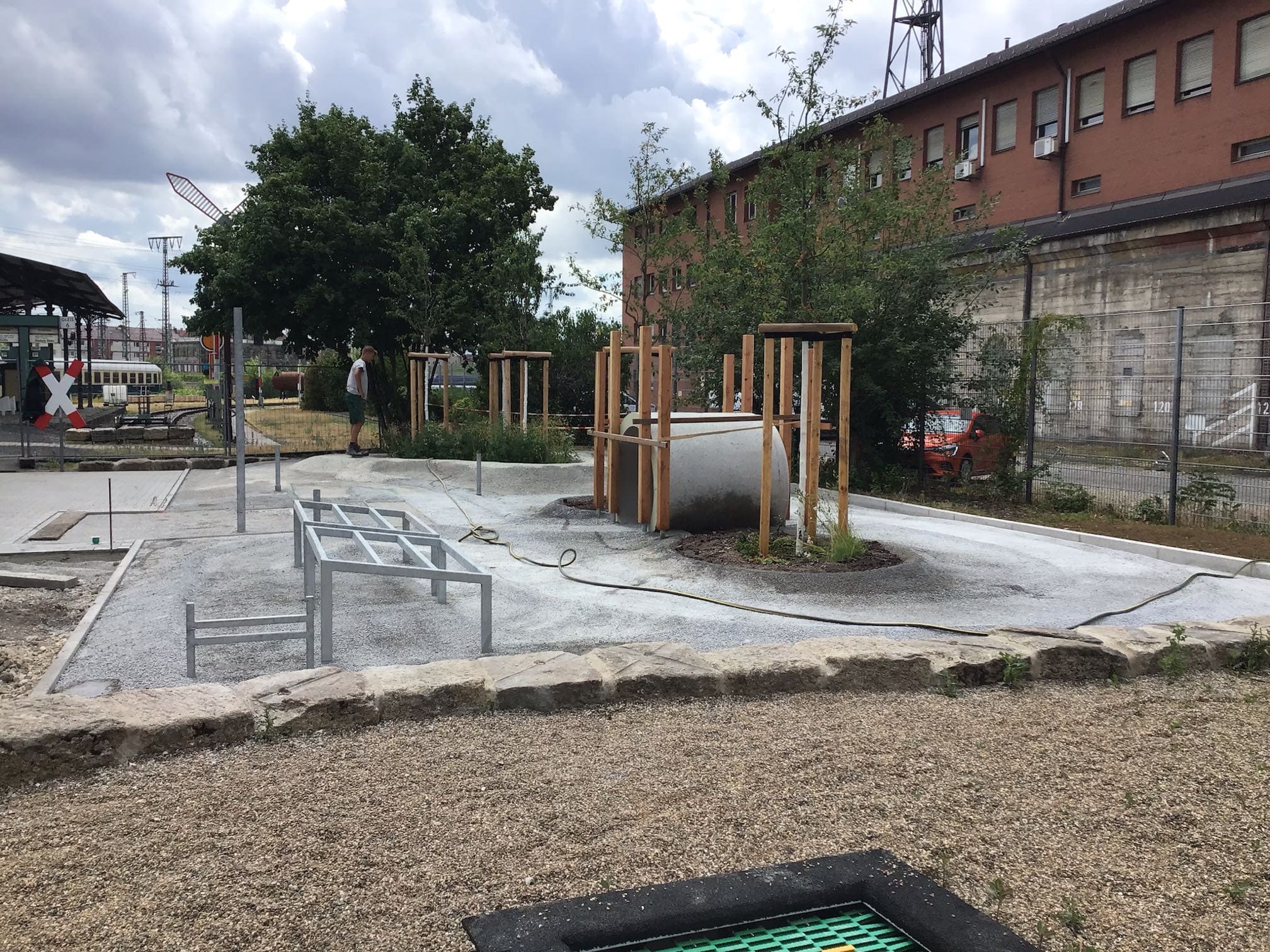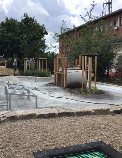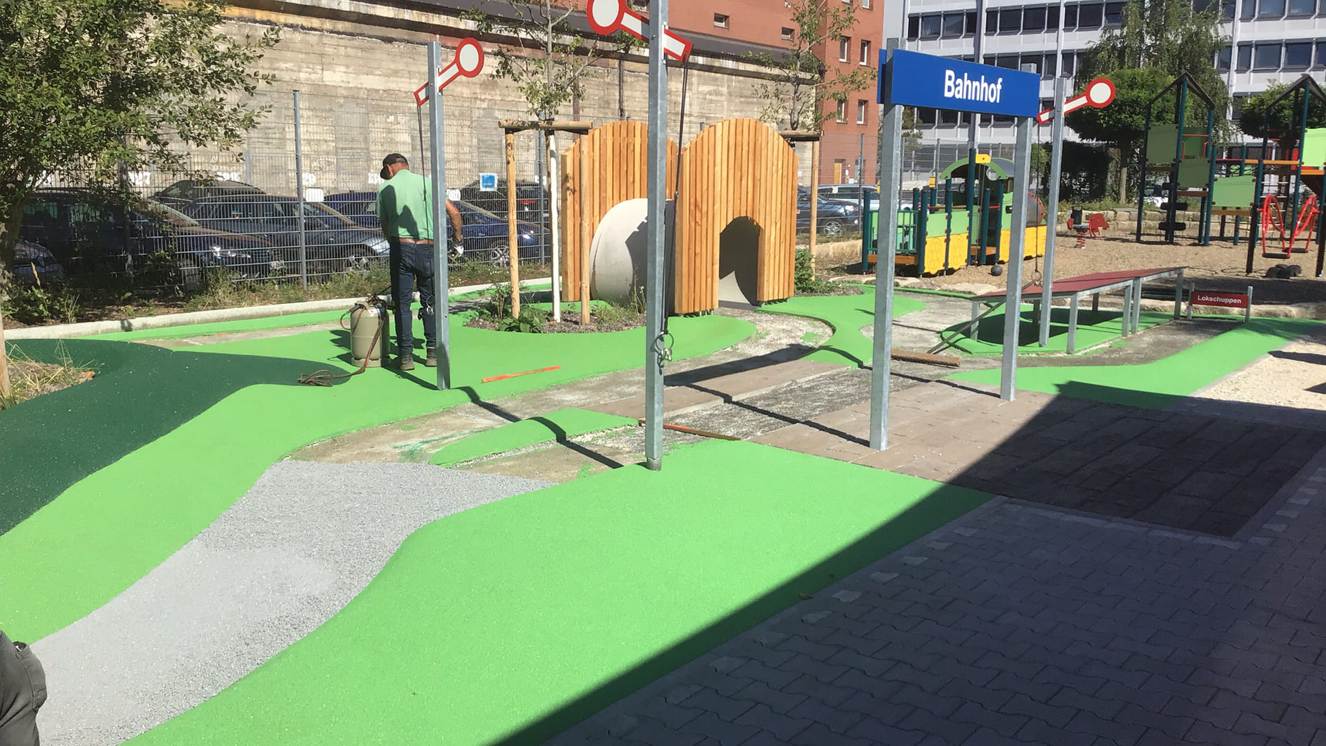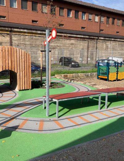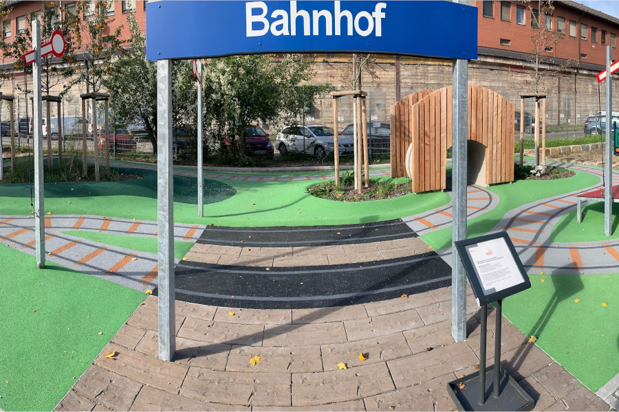 Die Mini-Landschaft aus geschwungenen Wegen und Hügeln aus Drain-Beton und grünem Gummigranulat ist startklar für begeisterte Mini-Zugführer:innen!