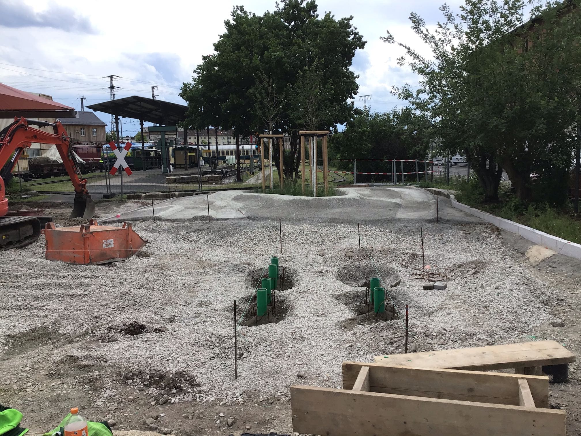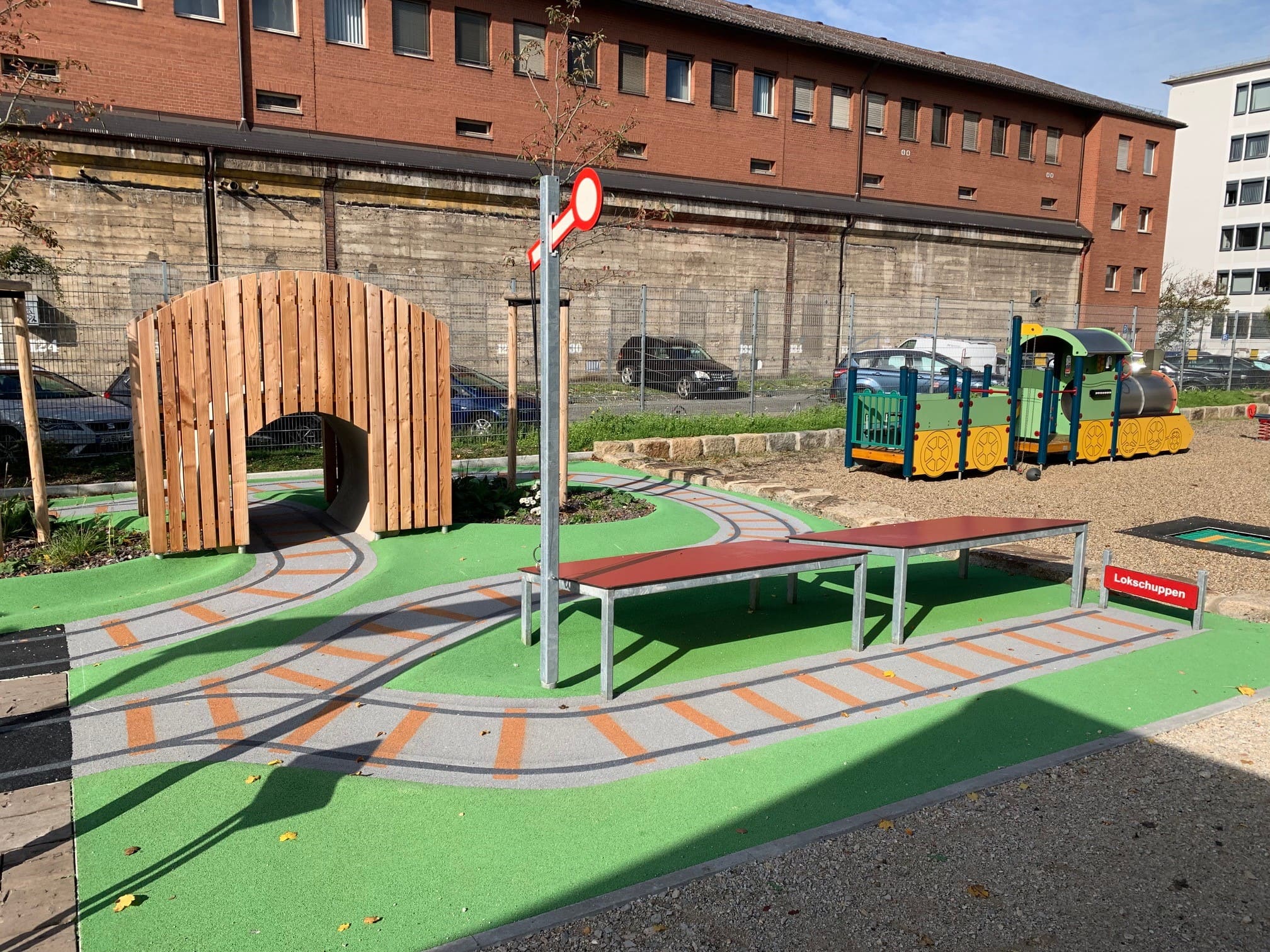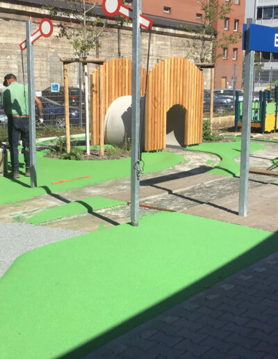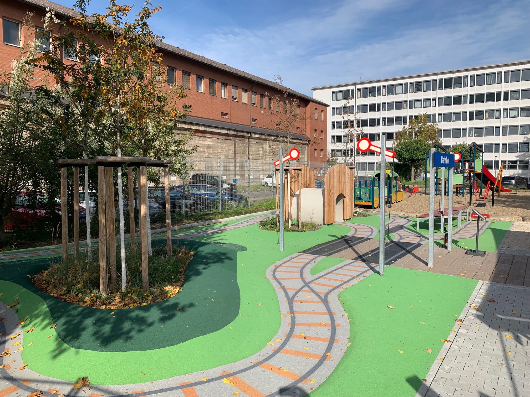 Die Mini-Landschaft aus geschwungenen Wegen und Hügeln aus Drain-Beton und grünem Gummigranulat ist startklar für begeisterte Mini-Zugführer:innen!
