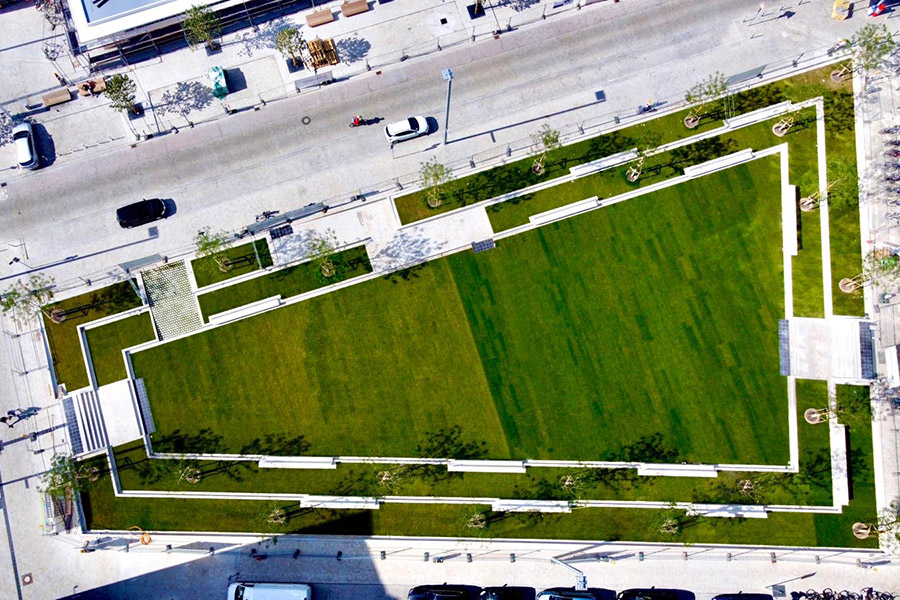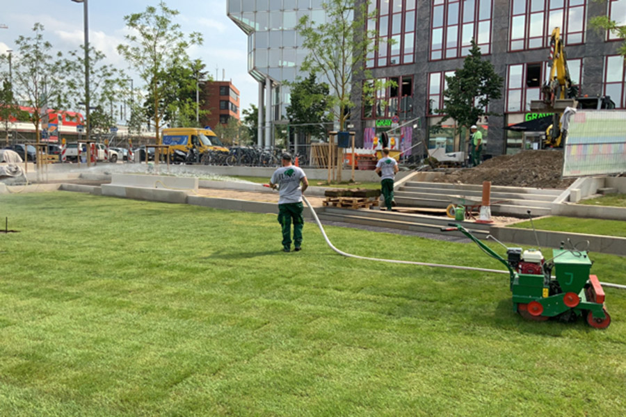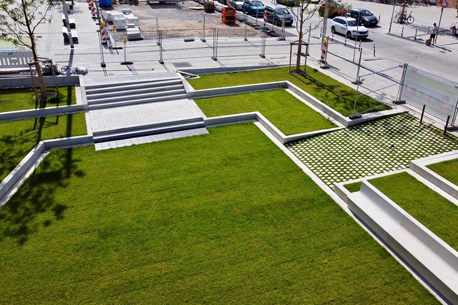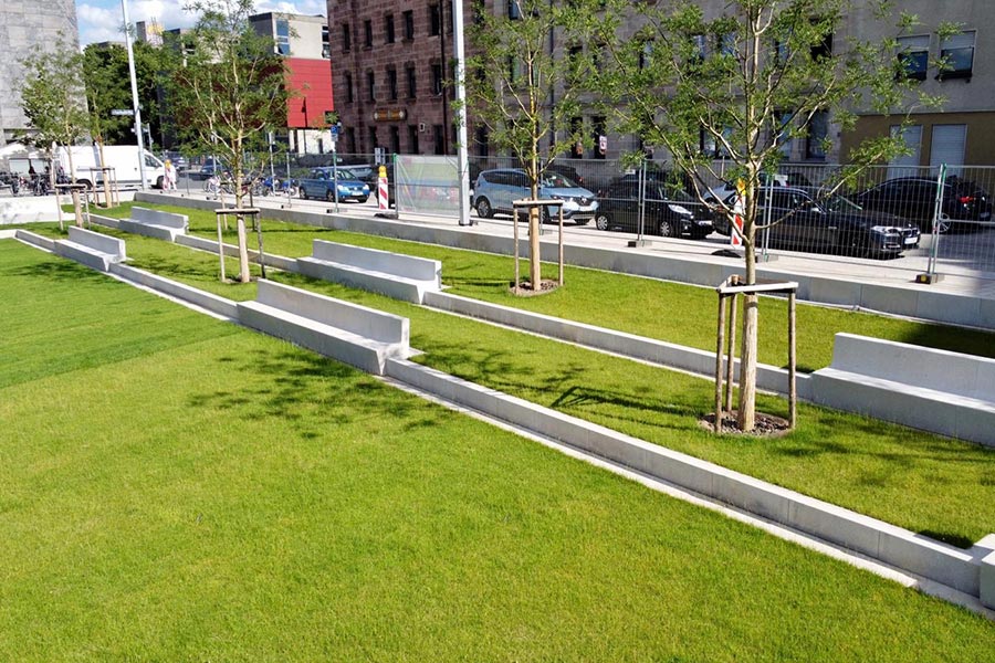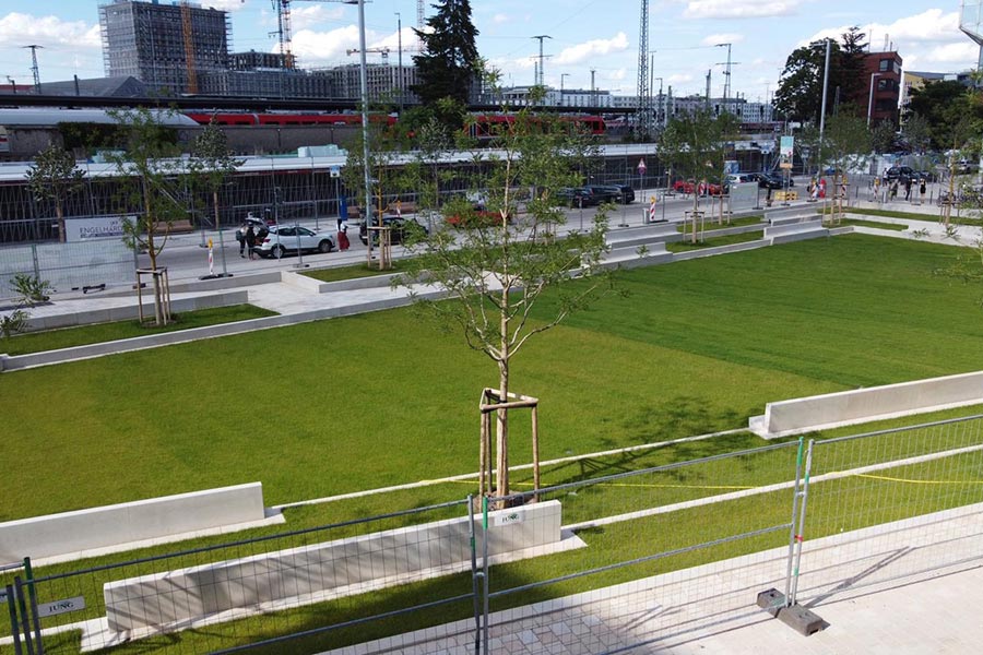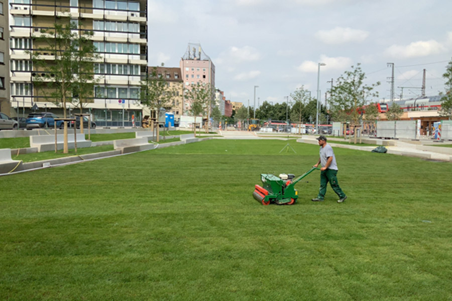 Große Rasenflächen, insgesamt 70 Bäume und zahlreiche Sitzgelegenheiten aus Granitstein vereinen sich hier mitten in der Stadt zu einer grünen Erholungsoase für die Nürnberger Bürger. Und damit hier auch zukünftig immer alles schön grün bleibt, haben unsere Mitarbeiter*innen nach den Plänen des Landschaftsarchitekten Rainer Schmidt ein Novum in der Bewässerungstechnik geschaffen: die komplette Bewässerung und Düngung der Grünflächen erfolgt unterirdisch – so wird eine gleichmäßige Versorgung der Pflanzen gewährleistet und kein Besucher wird von plötzlich startenden Wassersprenklern behelligt!