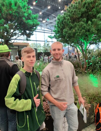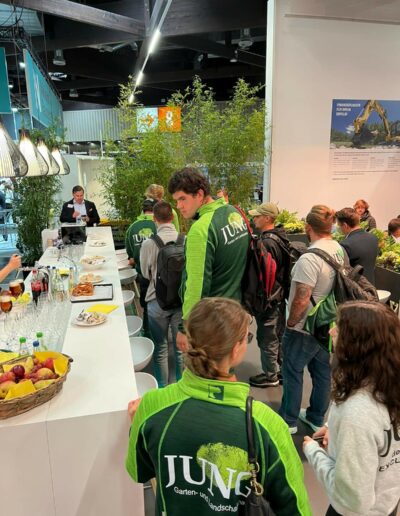 Außerdem hatten die Azubis auch noch kleine Aufträge auf der Messe zu erledigen: aufgeteilt in mehrere Teams sollten sie zum Beispiel selbständig erkunden, welche Bäume und Stauden die ausstellenden Baumschulen für besonders zukunftsfähig halten oder technische Vergleiche bei den ausgestellten Minibaggern anstellen.